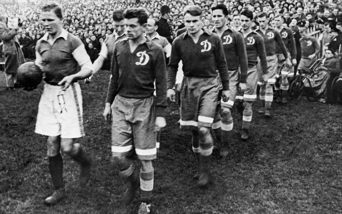 Сегодня российские клубы в еврокубках уступают австрийцам и бельгийцам, а 75 лет назад, всего через полгода после войны, молчаливые парни в майках с большой буквой «Д» произвели фурор на Туманном Альбионе. Они поставили в тупик родоначальников футбола из «Челси» и «Арсенала» и преподали урок «Кардиффу» и «Глазго Рейнджерс». Две победы и две ничьи при соотношении мячей 19:9 навсегда вошли в историю. Не только английскую и не только спортивную.