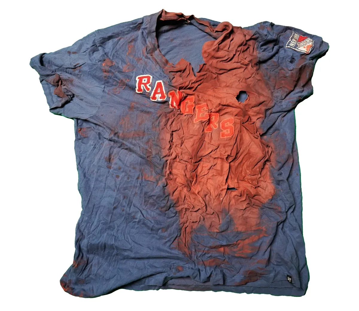 Вот наш вещдок — та самая испачканная краской футболка с символикой хоккейной команды New York Rangers. Несколько небольших фрагментов ткани отсутствуют — они понадобились для экспертизы.