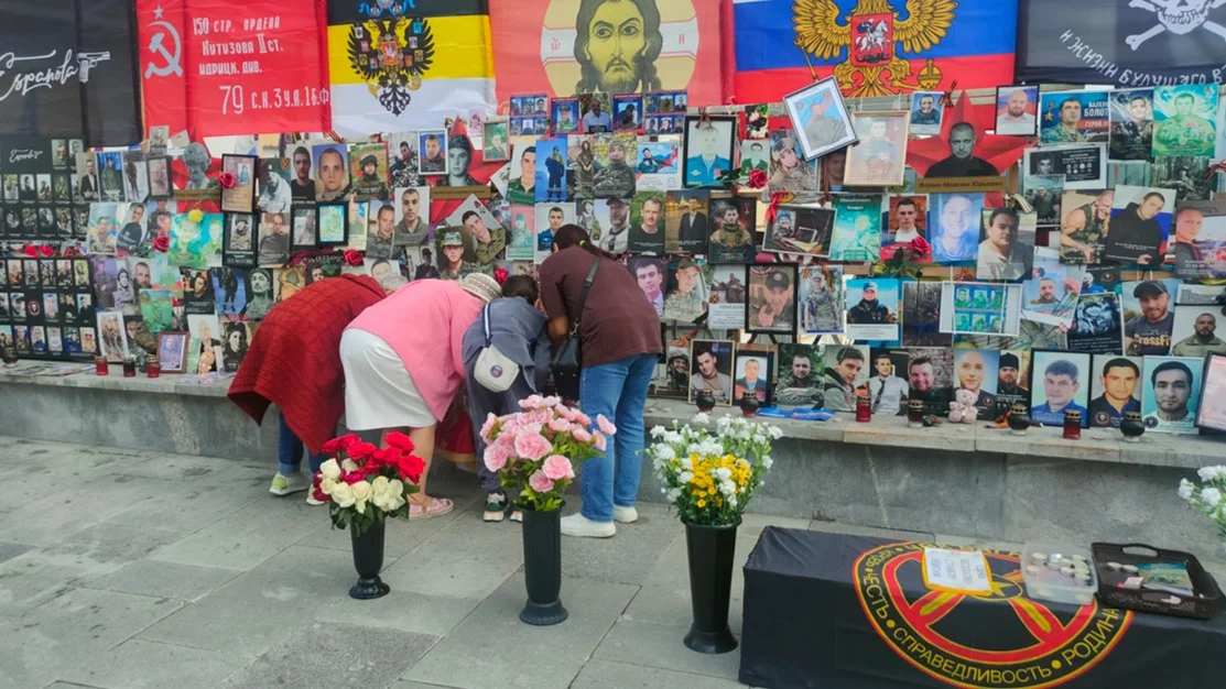 Мемориал погибшим вагнеровцам находится прямо перед колокольней Знаменского монастыря на Варварке. Это стена с сотней фотографий погибших бойцов как ЧВК, так и регулярной армии. Кругом — флаги. Один из них — вагнеровский. На другом изображен образ Спаса Нерукотворного. Сзади развевается флаг Российской империи с надписью «Мы русские, с нами Богъ».