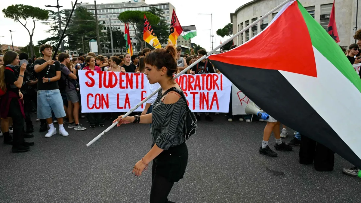 Италия. Студенты маршируют под баннером с надписью «Студенты и рабочие с Палестиной». Фото: ANDREAS SOLARO / AFP / East News