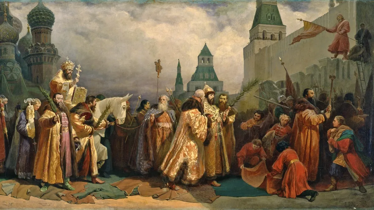 Вербное Воскресение в Москве при царе Алексее Михайловиче. Шествие патриарха на осляти», 1865 г. Источник: Википедия