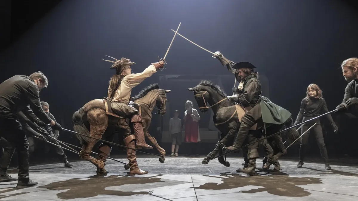 То есть все курящие артисты в затакте «Трех мушкетеров» Дмитрия Крымова на сцене затягиваются не по-детски упоительно. Они в черных трико, сцена — черный кабинет, так что огоньки, которые сперва принимаешь за звездочки, вспыхивают как бы в космосе. Дети в восторге — судя по всему, здесь можно все, что нельзя.