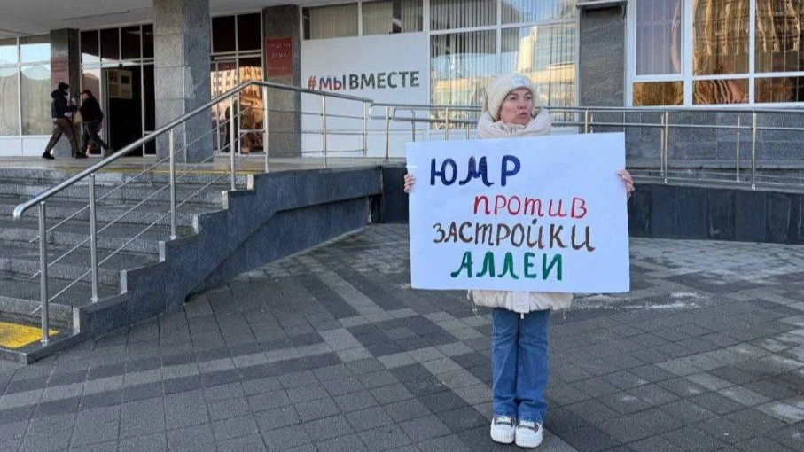 На плакате было написано: «ЮМР против застройки аллеи». ЮМР — это Юбилейный район Краснодара. Аллея — это распространенное среди местных жителей наименование сквера имени 80-летия Краснодарского края, находящегося на набережной реки Кубани.