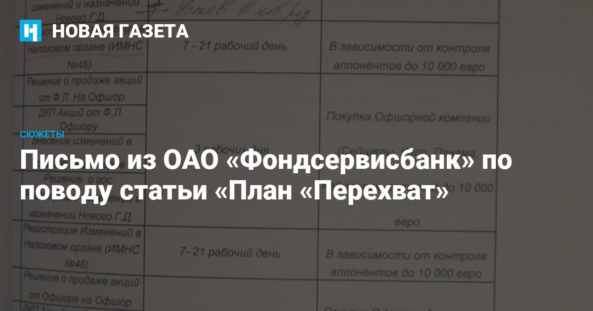 В номере 14 «Новой газеты» от 10 февраля с.г. был опубликован материал под громким названием «План «Перехват», формально посвященный коррупции в правоохранительных органах, но фактически дискредитирующий в первую очередь ОАО «Фондсервисбанк», которому автор статьи приписывает участие в противоправной деятельности, а именно рейдерских операциях. Мы решили воспользоваться предложением явно введенной кем-то в заблуждение уважаемой газеты прокомментировать опубликованные «сенсационные» факты.