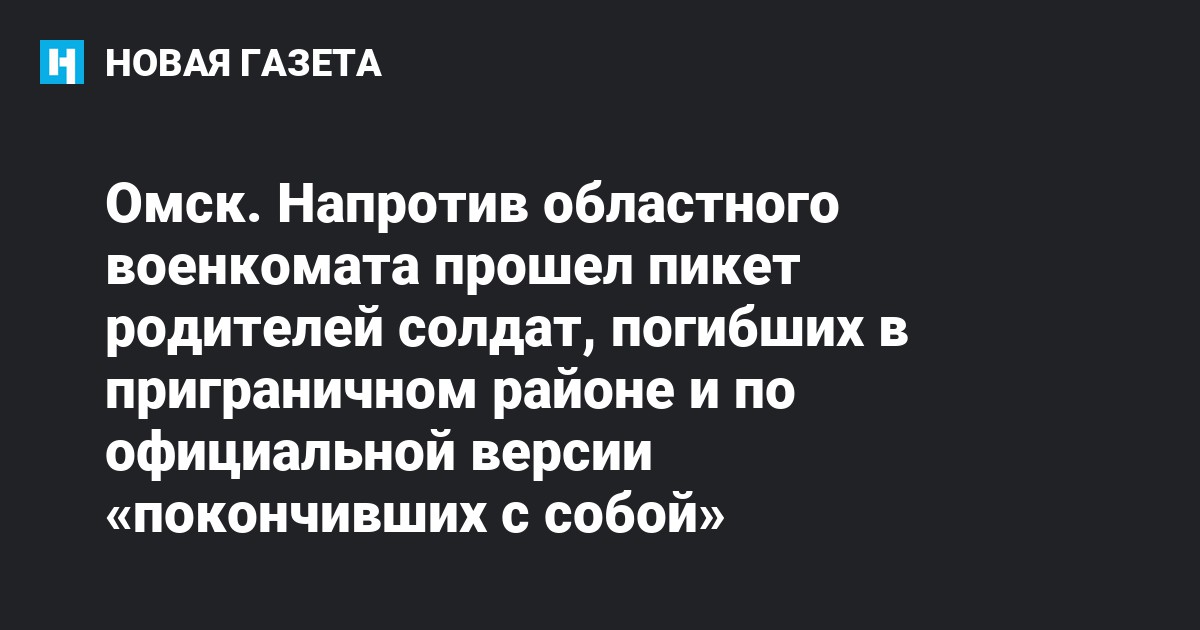 Эта акция протеста отличалась от всех, проходивших когда-либо в Омской области, а, может быть, и в стране. 3 июня с 16 до 17 ч. в пикете напротив облвоенкомата стояли родители погибших солдат, призванных в разное время, но в одно место – город Бикин Хабаровского края. По данным родительского союза «Память» (а обращаются туда далеко не все получатели «груза–200») в этом приграничном районе погибли при загадочных обстоятельствах семеро омичей. На плакате, развернутом матерями, их имена: «Марат Буртубаев, Александр Усов, Андрей Ким, Александр Дзичковский, Алексей Апарин…».