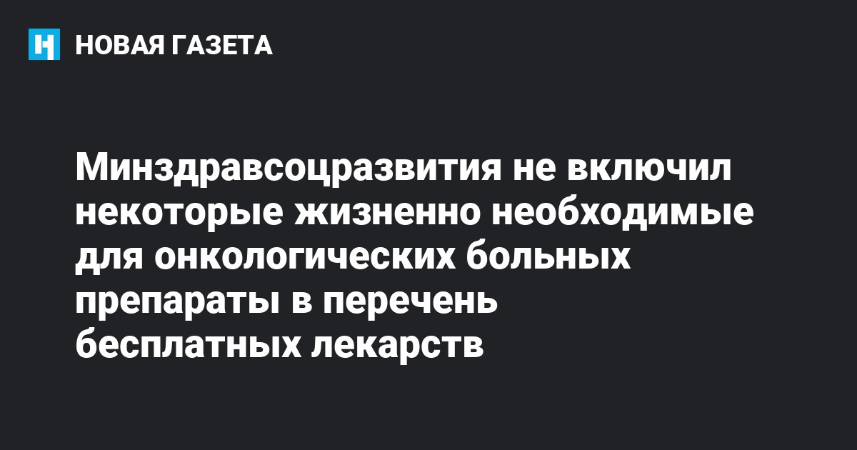 Минздравсоцразвития не включил некоторые жизненно необходимые для лечения онкологических больных лекарственные препараты в перечень лекарств, которыми эти больные обеспечиваются бесплатно. Фонд «Подари жизнь» не согласен с позицией министерства по поводу формирования перечня жизненно необходимых и важнейших лекарственных препаратов (ЖНВЛП). В Фондесчитают, что в основу формирования списка заложен принцип экономическойцелесообразности, а не интересы пациентов.