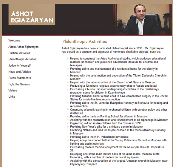 Ашот Егиазарян, фигурант наших многочисленных публикаций о коррупции и преступности, экс-банкир и депутат от ЛДПР, сейчас проживает в США, претендует на статус жертвы путинского режима и, как следствие, — политического беженца, дающий иммунитет от экстрадиции. Главной площадкой для промоушена подобных претензий стал недавно созданный сайт ashot-egiazaryan.com. Создатели портала — американские пиарщики — постарались сформировать образ безупречного бизнесмена, политика и филантропа.