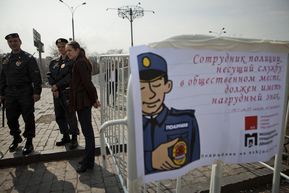 Найти полицейского без нагрудного знака было очень трудно. Однако у многих на груди виднелись бляхи старого образца. Когда полиция еще была милицией, их должны были носить только патрульные, объяснил Ниненко. Так что есть они не у всех. «Мы понимаем, это ваше начальство виновато, что вам новый нагрудный знак не выдают. Давайте мы напишем на них жалобу в прокуратуру», – говорили участники акции. «А пишите», – благодушно отвечали те.