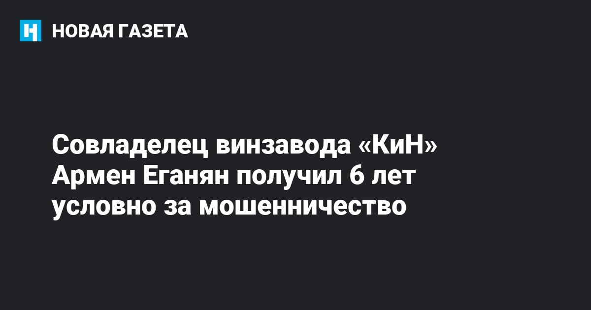 Басманный суд города Москвы приговорил председателя совета директоров вино-коньячного завода Кин Армена Еганяна к шести годам лишения свободы условно за мошенничество в особо крупном размере, пишет «Газета.Ru». В качестве дополнительного наказания фигуранта назначен штраф в размере 1 млн рублей.