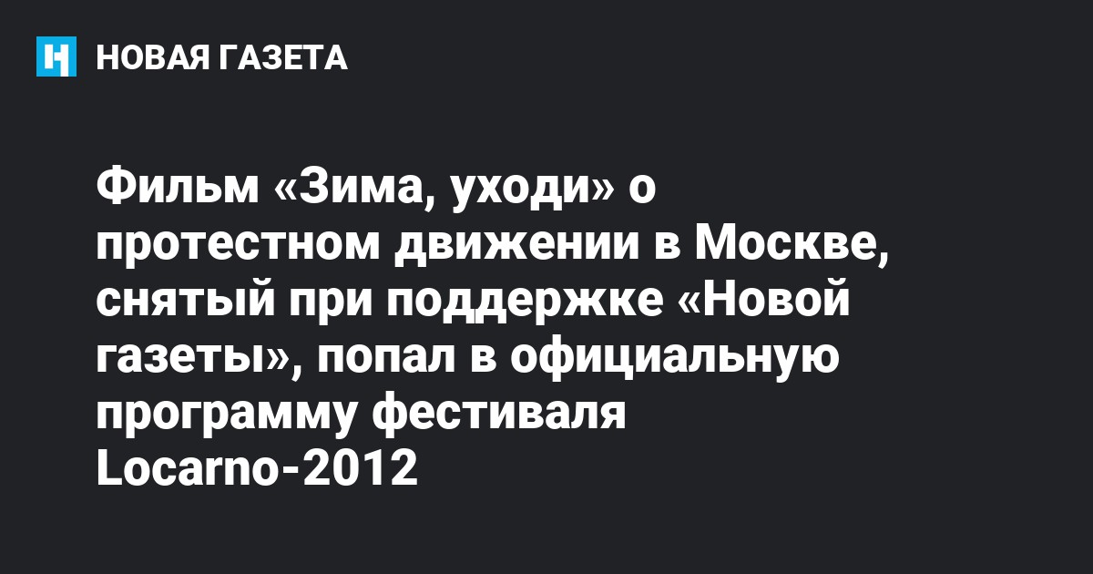 Документальный фильм «Зима, уходи», снятый по инициативе «Новой газеты», попал в официальную программу 65-го Международного фестиваля в Локарно. Об этом сегодня было объявлено во время официальной церемонии номинирования. Кинофестиваль будет проходить с 1 по 11 августа в городе Локарно (кантон Тичино, Швейцария).