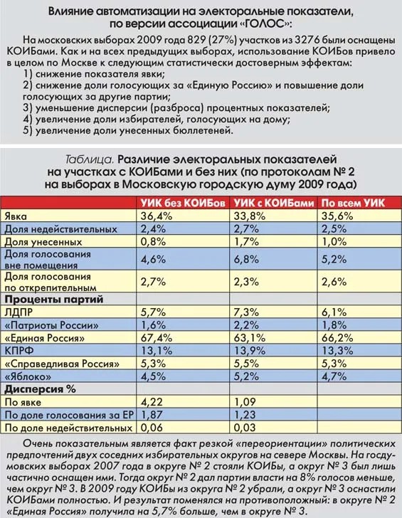 — Статистически достоверно установлено, что машины считают намного честнее, чем люди. Более того, опыт прошлых выборов показывает, что на участках, оснащенных КОИбами, явка избирателей, а также результат голосования за «Единую Россию» ниже примерно на 5%, а количество голосов, отданных, например, за партию «Яблоко», на 3% больше. Также известно, что на участках, где КОИБы не использовались, существенно выше степень «разброса» (дисперсия) итогов голосования.