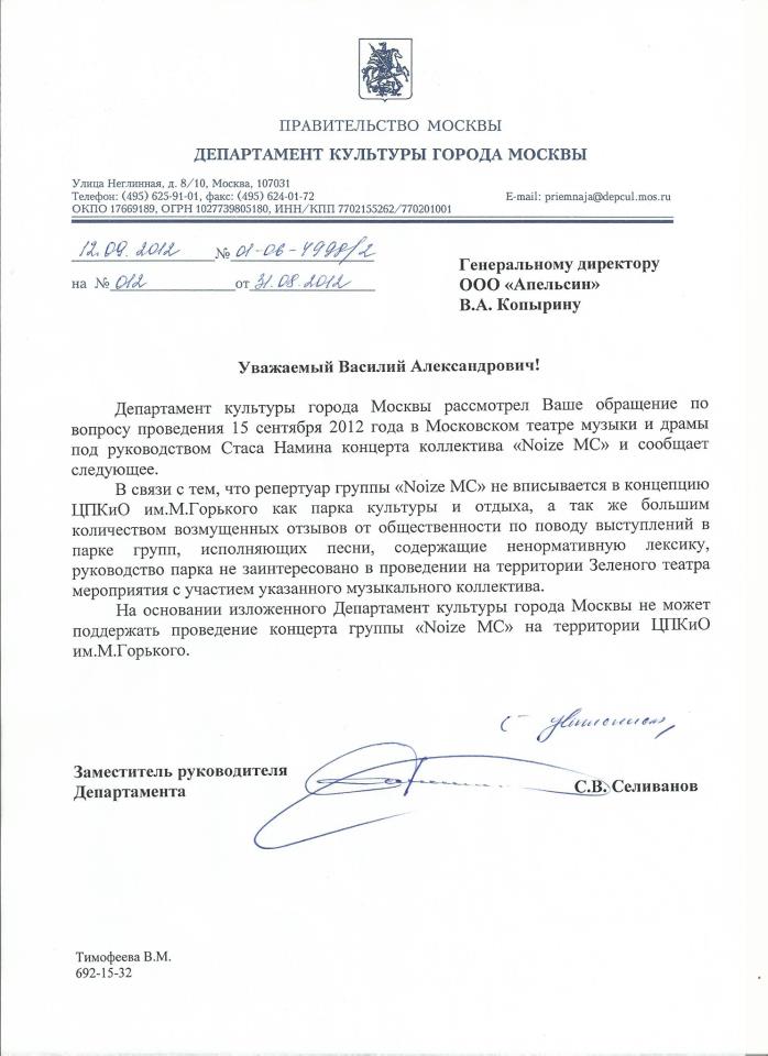 Сегодня вечером стало известно, что Департамент культуры Москвы фактически отменил концерт Ивана Алексеева (выступающего как Noize MC), который должен был пройти в Зеленом театре парка Горького 15 сентября. В письме, направленном организатору концерта, компании PromoEnd, сообщается, что репертуар группы «не вписывается в концепцию ЦПКиО им.Горького», а руководство парка «не заинтересовано в проведении мероприятия» из-за «возмущенных отзывов от общественности по поводу выступлений в парке групп, исполняющих песни, содержащие ненормативную лексику».