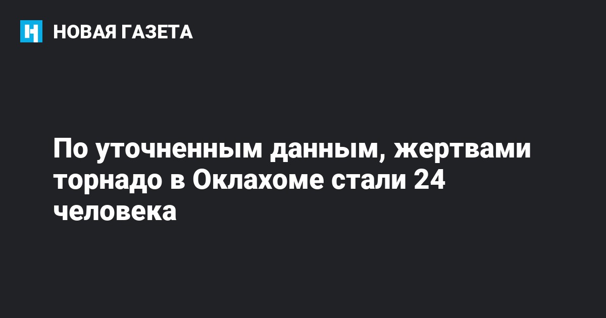 Число погибших в результате торнадо в американском штате Оклахома составило, по уточненным данным, 24 человека, сообщает ИТАР-ТАСС со ссылкой на руководителя медицинского центра в Оклахома-Сити Эми Эллиот. Ранее местные СМИ называли другие данные – от 50 до 90 погибших.