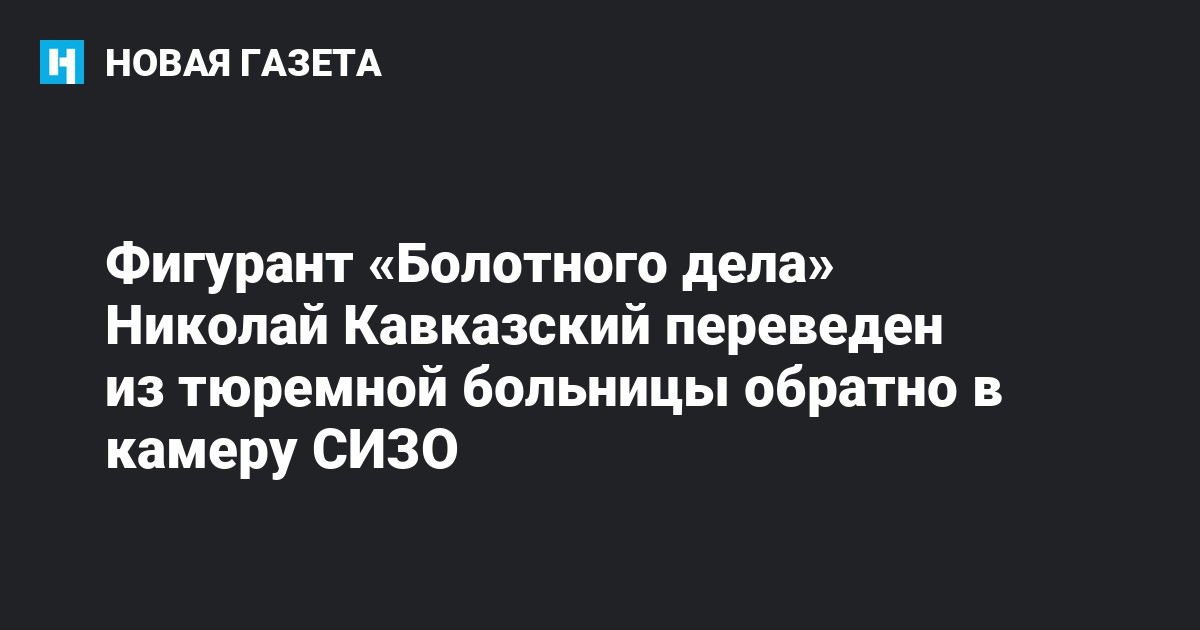 Фигурант «Болотного дела» Николай Кавказский переведен из больницы СИЗО «Матросская тишина», где он в течение полутора месяцев проходил медицинское обследование, обратно в СИЗО №2 («Бутырка»). Обследование выявило гепатоз (заболевание печени, связанное с нарушением обмена веществ), проявляющийся в виде ожирения третьей степени.