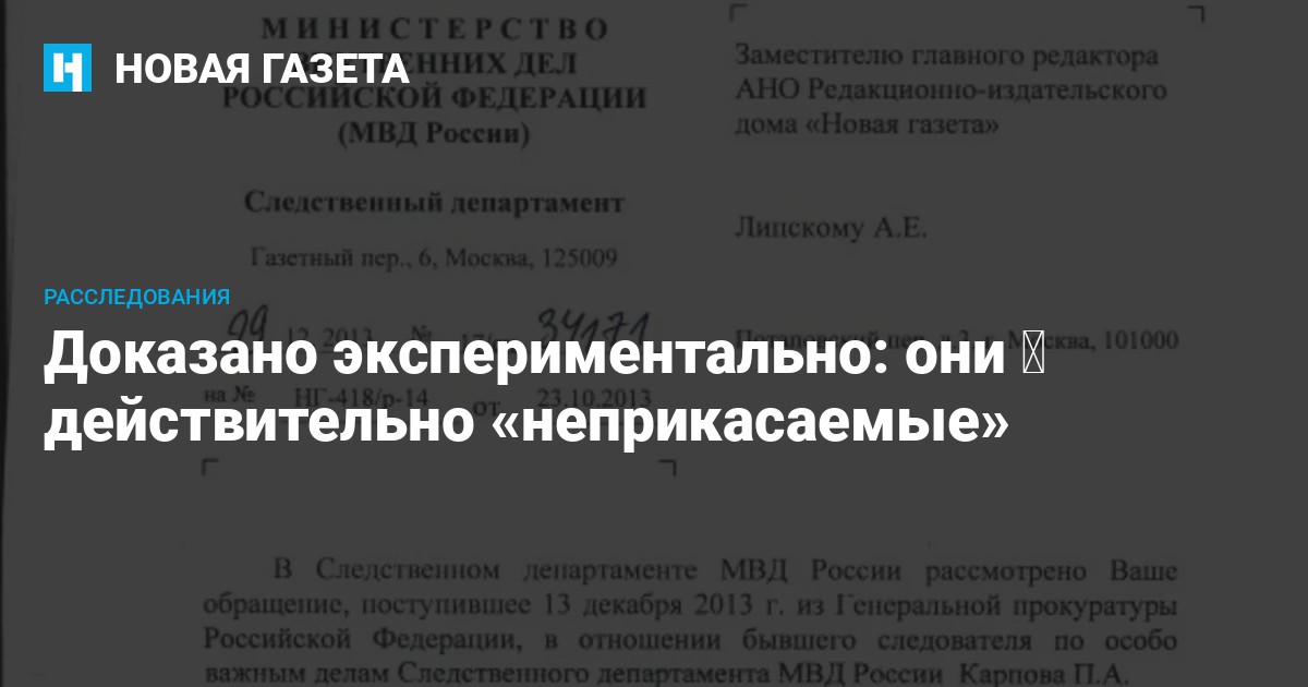 Но Следственный департамент МВД, в свою очередь, не согласился с прокуратурой, заявив, что «проверка сведений, изложенных П.А. Карповым в Высшем суде Лондона, не входит в компетенцию органов предварительного следствия МВД России». А, собственно, почему?