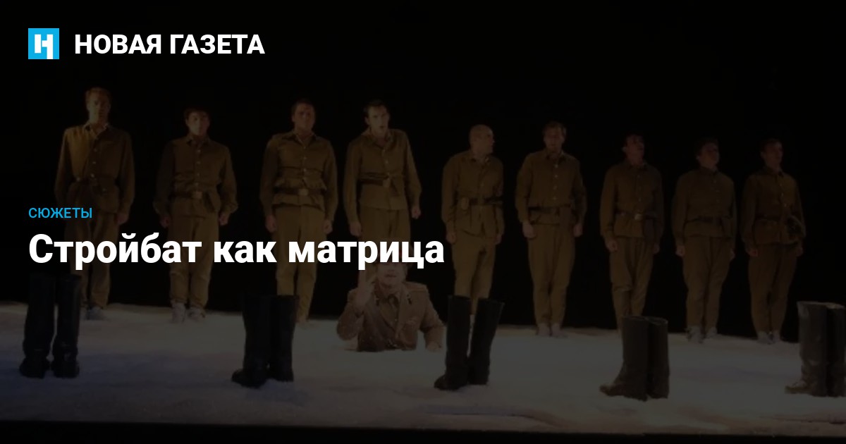 «Стройбат» Каледина — последние несколько дней перед дембелем рядового Константина Карамычева. Проза, казалось бы, куда страшнее, чем происходящее на сцене, — гуще, беспросветнее. Но додинское отвязно-условное решение неожиданно отрывает ее от земли: облаком зависнув над родимой почвой, она обращается в матрицу. Старую и вечно новую: механизм государства против человека, произвол против свободной воли, обстоятельства против личности. Спектакль исследует типическое бытие «человека армейского», перестающего быть разумным, чувствующим, теряющим свою природу — и обостряющим инстинкты. Короче, проявления характеров в одном из самых трудных испытаний повседневности.