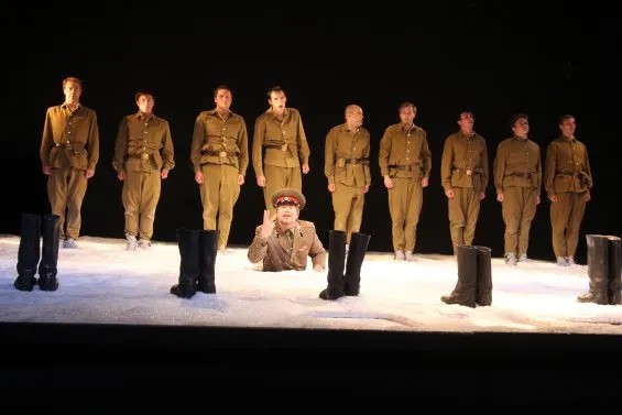 Ритм рассчитан с художественной четкостью. Двадцать эпизодов, в которых растет и взрывается напряжение. В начале капитан Лысодор увещевает взвод, вбивая в головы одно и то же: не напивайся! Выпил — не бросай товарища на спине! Переверни его на живот! Чтобы он не захлебнулся рвотными массами блевотины. Зал в ответ сначала громко смеется. Потом смеется тише. Потом стихает. А тот все повторяет.