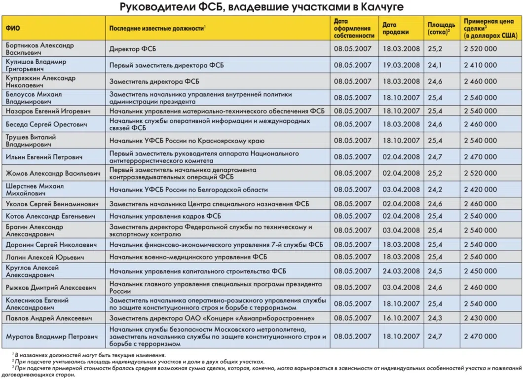 Таким образом, Александр Бортников, которому принадлежало 19,8 сотки, а также 1/20-я доли в двух участках общей площадью 108 соток (то есть почти еще 5,4 сотки), по подсчетам «Новой газеты», мог заработать около 2,5 млн долларов на продаже земли в Калчуге. Следуя нашим подсчетам, примерно такие же суммы могли получить заместители Бортникова — Александр Купряжкин и Владимир Кулишов, а также остальные руководители ФСБ. Естественно, сумма сделок могла варьироваться в зависимости от индивидуальных особенностей участков и пожеланий собственника и покупателя, потому, повторимся, здесь и далее в таблице мы указываем средние значения.
