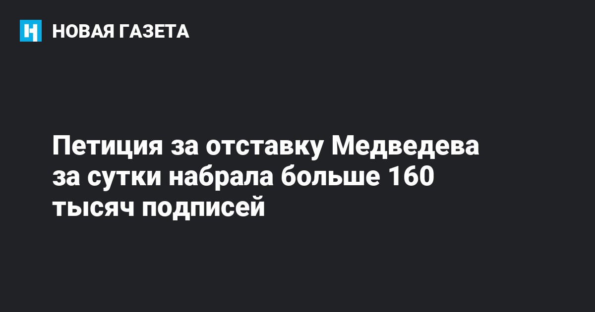 Петиция за отставку Дмитрия Медведева с поста премьер-министра России, опубликованная на портале Change.org, за сутки набрала более 160 тысяч подписей.
