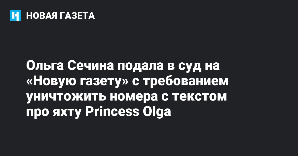 В понедельник редакция «Новой газеты» получила иск Ольги Сечиной по поводу материала Романа Анина «Секрет «Принцессы Ольги». Как руководитель «Роснефти» Игорь Сечин связан с одной из самых роскошных яхт в мире?», опубликованного 1 августа текущего года.