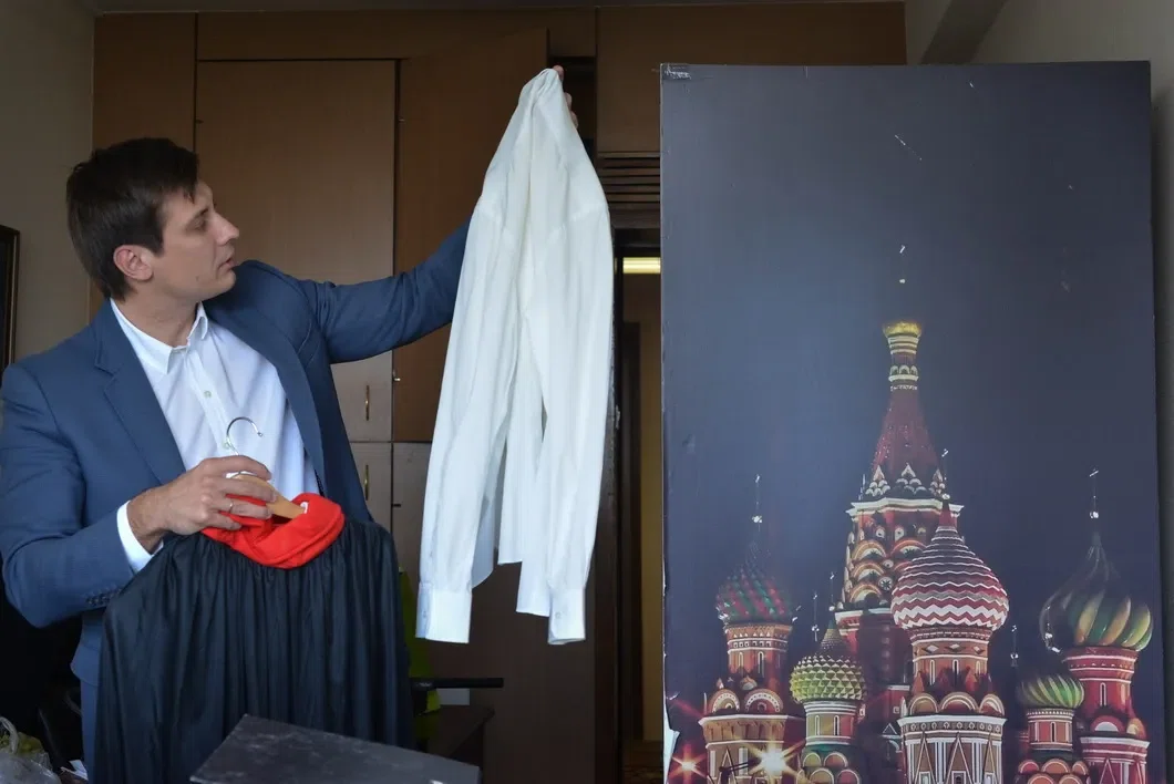 Гудков кладет в зеленую сумку из «Ашана» фотографию с Немцовым, подарочный коньяк и отцовскую статуэтку (Георгий Победоносец). «Ну и все в принципе, — говорит, оглядываясь вокруг. — Меня с этой комнатой мало что связывает, я же не в кабинете сидел, а в зале обычно».