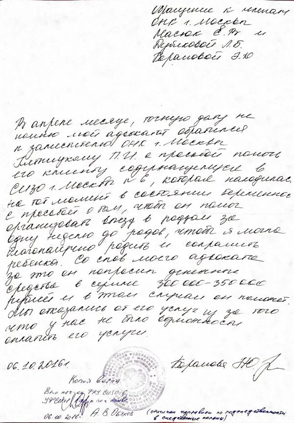 «В апреле месяце, точную дату не помню, мой адвокат обратился к заместителю ОНК Москвы Пятницкому П.И. с просьбой помочь его клиенту, содержащемуся в СИЗО № 6 г. Москвы, которая находилась на тот момент в состоянии беременности, с просьбой о том, чтобы он помог организовать выезд в роддом за одну неделю до родов, чтобы я могла благополучно родить и сохранить ребенка. Со слов моего адвоката, за это он попросил денежные средства в сумме 300 000 — 350 000 рублей, и в этом случае он поможет. Мы отказались от его услуг из-за того, что у нас не было возможности оплатить его услуги».