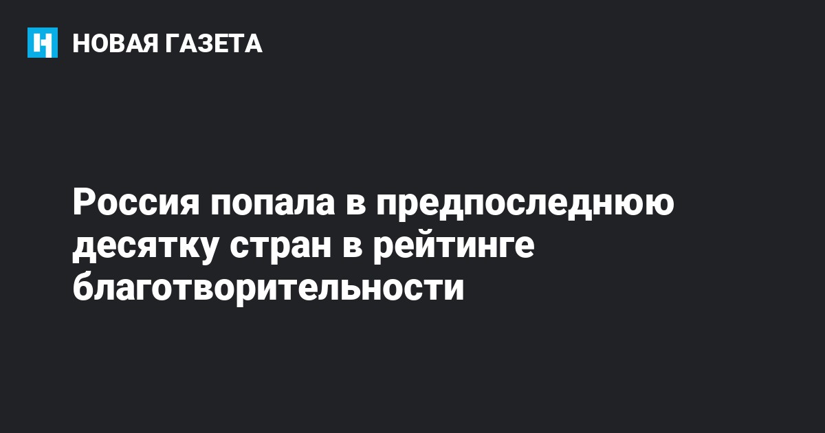 Россия заняла 126 место в списке 140 стран по количеству людей, делающих взносы на благотворительность. Об этом сказано на сайте фонда Charities Aid Foundation (CAF), опубликовавшего «Мировой рейтинг благотворительности».