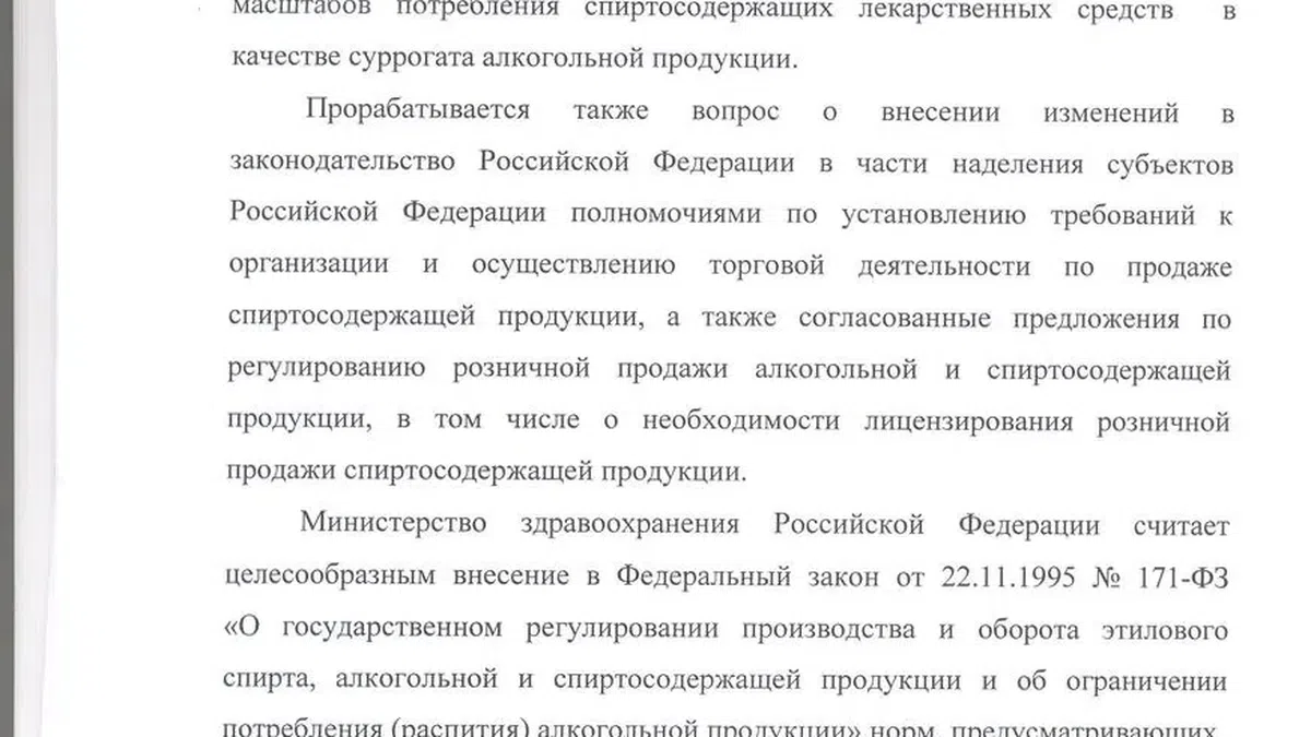 В заключении Минздрав сообщает, что считает «целесообразным внести изменения в ФЗ «О государственном регулировании производства и оборота этилового спирта, алкогольной и спиртосодержащей продукции и об ограничении потребления (распития) алкогольной продукции» с тем, чтобы разрешить субъектам РФ самим принимать решения о розничной продаже фанфуриков (спиртосодержащей продукции с содержанием этилового спирта более 25%) в регионе и ввести на это дело лицензирование».