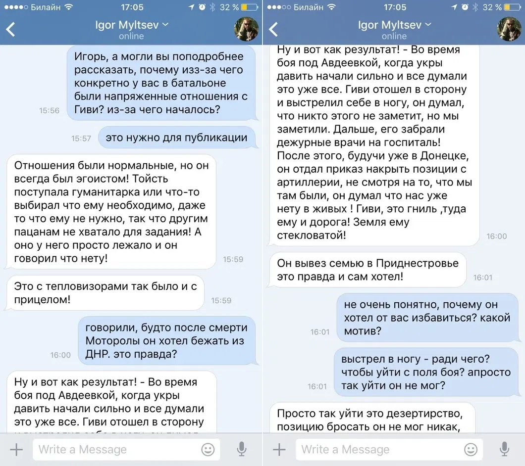 «Ему отомстил бы любой», — рассказал Мыльцев, назвав обвинения властей ДНР в адрес украинских спецслужб «смешными»: «СБУ за линию разграничения не переходят, ссут суки!». Убийство командира Мыльцев называет местью сослуживцев, якобы, брошенных Гиви во время боя под Авдеевкой в конце января 2017 года.