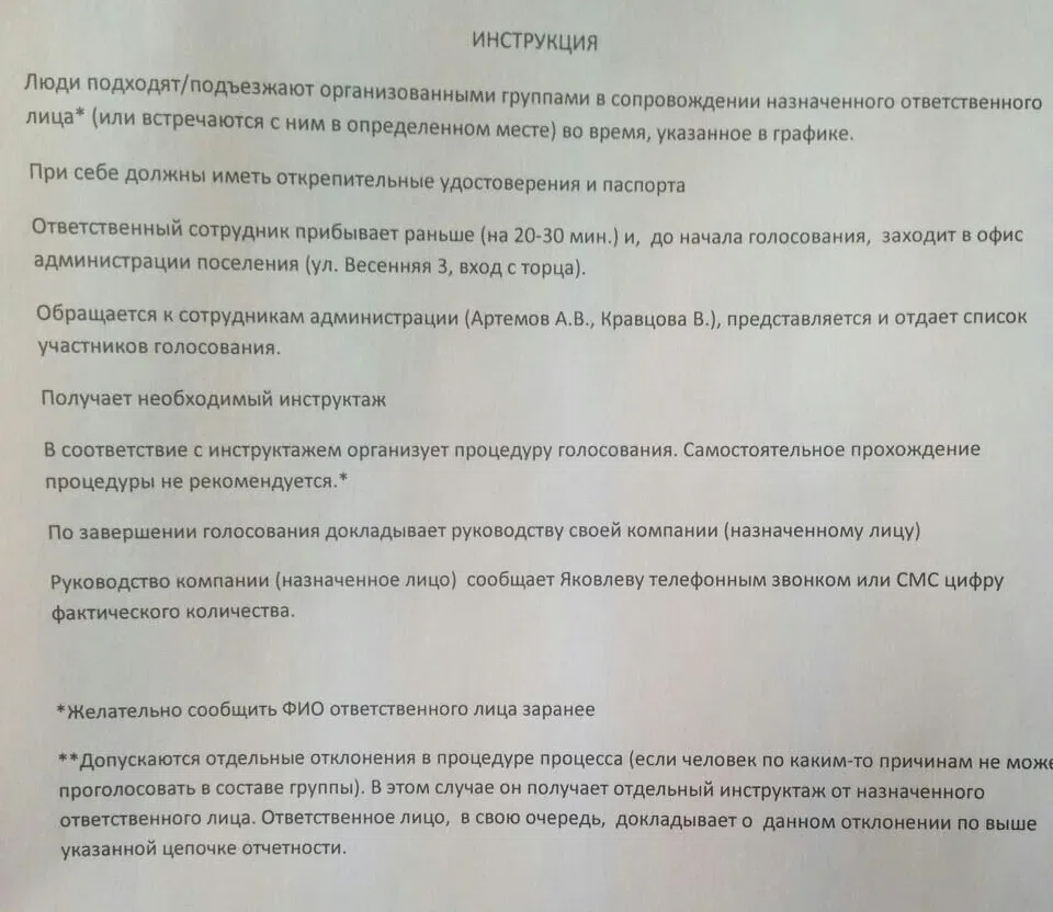 «Люди подходят/подъезжают организованными группами в сопровождении назначенного ответственного лица (или встречаются с ним в определенном месте) во время, указанное в графике. При себе должны иметь открепительные удостоверения и паспорта. Ответственный сотрудник прибывает раньше (на 20–30 мин) и до начала голосования заходит в офис администрации поселения (ул. Весенняя, 3, вход с торца). Обращается к сотрудникам администрации (Артемов А.В., Кравцов В.), представляется и отдает список участников голосования. Получает необходимый инструктаж. В соответствии с инструктажем организует процедуру голосования. Самостоятельное прохождение процедуры не рекомендуется», — гласит документ (по указанному адресу находится администрация Волжского района Самарской области. — А.Б.).
