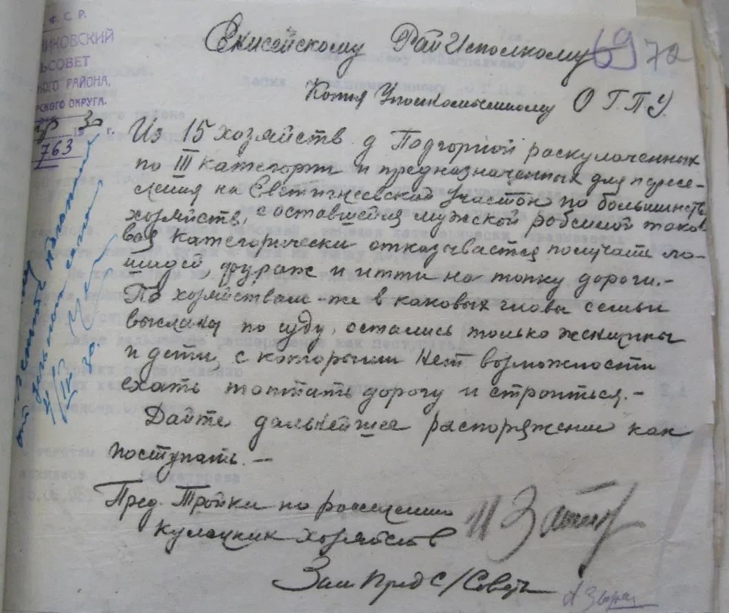 Первую-вторую категорию «кулаков» выслали. Но остается еще третья категория, которую надо отправлять в «кулацкий поселок» внутри района, в тайгу. Точнее, никакого поселка еще нет, и даже дороги туда еще нет. А на дворе март, двухметровые сугробы не растаяли и покрылись настом. Надо «топтать» дорогу, а это не один десяток километров по снежной целине. Бабы с детьми топтать не могут, а мужики, еще оставшиеся не арестованными, отказываются. Пятнадцать семей, у которых отобрано имущество, уже выгнанных из дома, живут в чьих-то хлевах, а в это время идет переписка. Характерно, что о людях речь не идет, идет — об «оставшейся мужской рабсиле». Начальство накладывает невнятную резолюцию, в которой видны только слова «выслать» и «положенное».