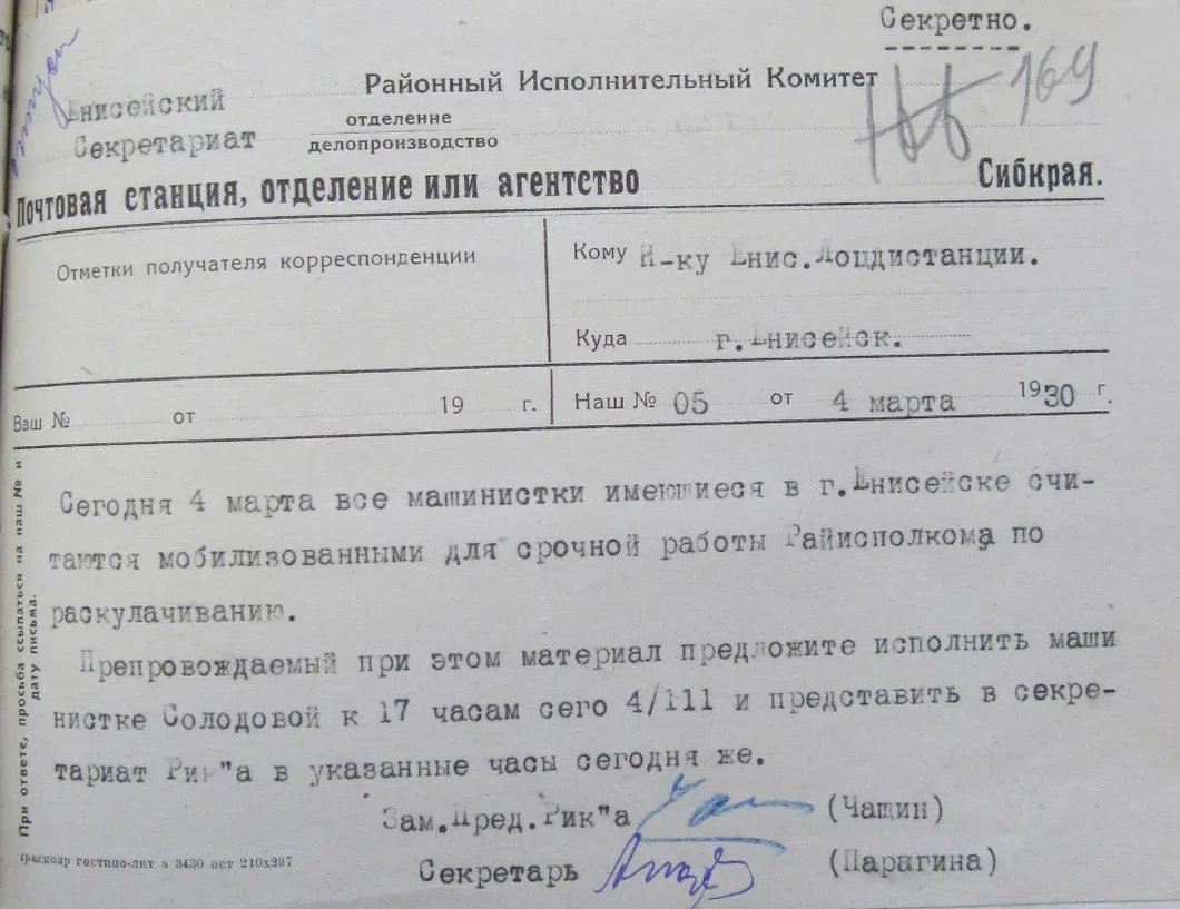 Вот, кстати, о пишущих машинках. В марте 1930 года высылка «кулацких» семей шла в очень сжатые сроки. Всего за пару недель райисполкомы с сельсоветами проделали очень большую бумажную работу. Составлялись и проводились через собрания «актива бедноты» списки на выселение, сельсоветы готовили полный комплект справок. Затем печатались в 5 экземплярах здоровенные, формата А3, протоколы заседания районной «тройки» по раскулачиванию. Эти протоколы надо было напечатать за один день, одна машинистка не справилась бы. Райисполком шлет депеши по организациям: «Сегодня, 4 марта, все машинистки, имеющиеся в г. Енисейске, считаются мобилизованными для срочной работы Райисполкома по раскулачиванию. Препровождаемый при этом материал предложите исполнить машинистке такой-то к 17 часам сего 4/III и представить в секретариат РИКа в указанные часы сегодня же».