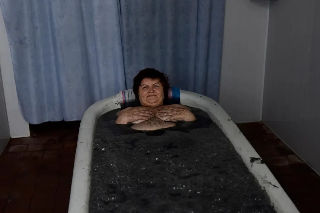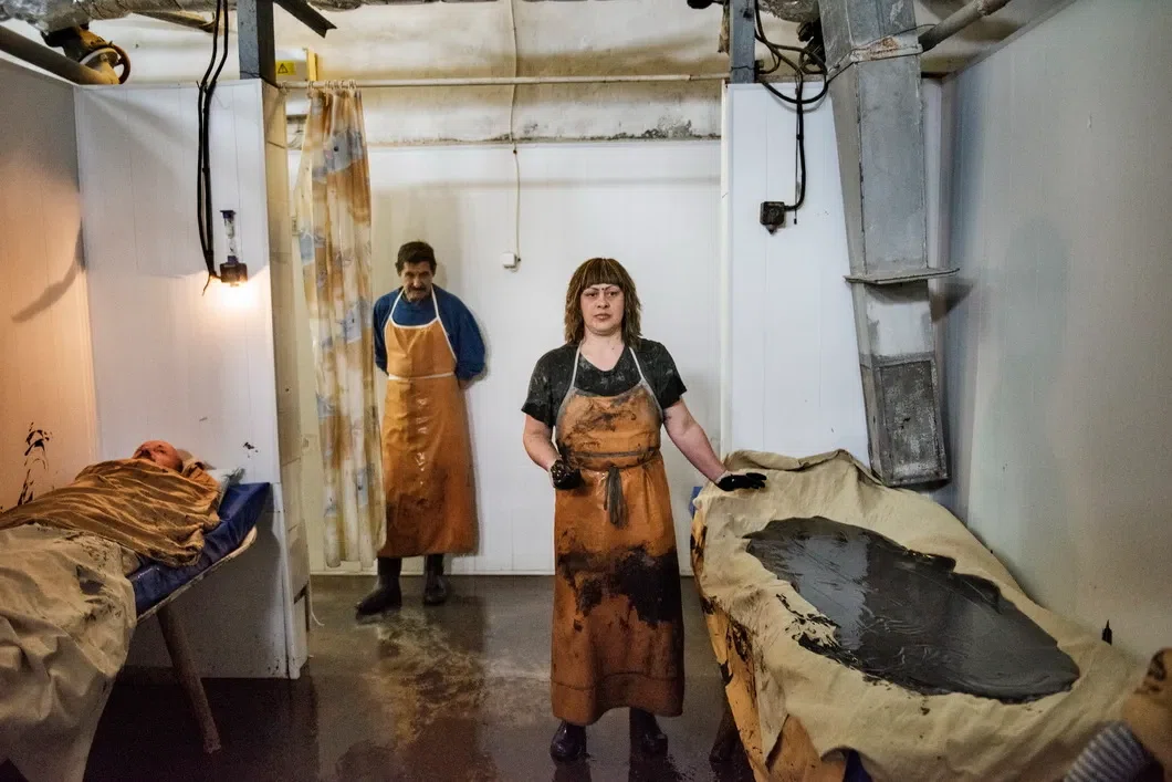 Женщина принимает грязевые ванны. Курорт Саки, Крым, ноябрь 2014 года.