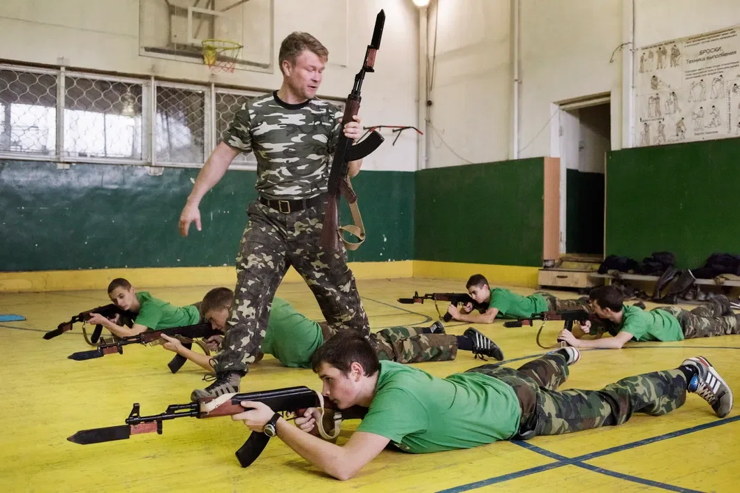 Пятнадцатилетний курсант Крымского казачьего кадетского корпуса стреляет из лазерного пистолета и автомата АК-47. Крым, Белоглинка, ноябрь 2014 года.