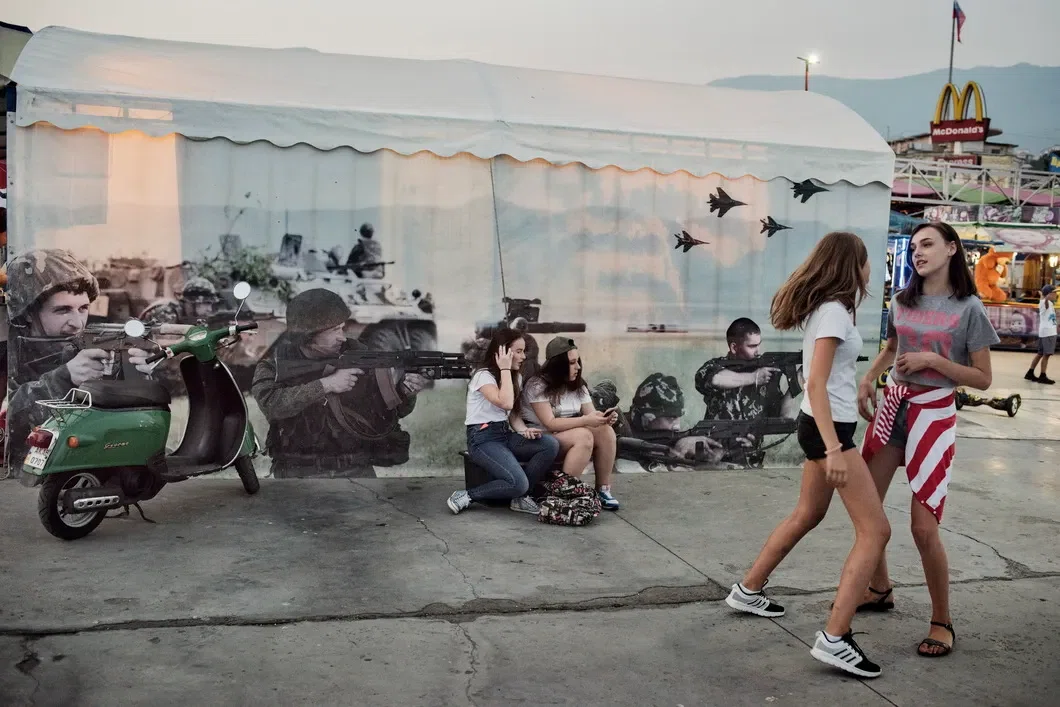 Девушки танцуют около тира. Ялта, июль 2016 года.