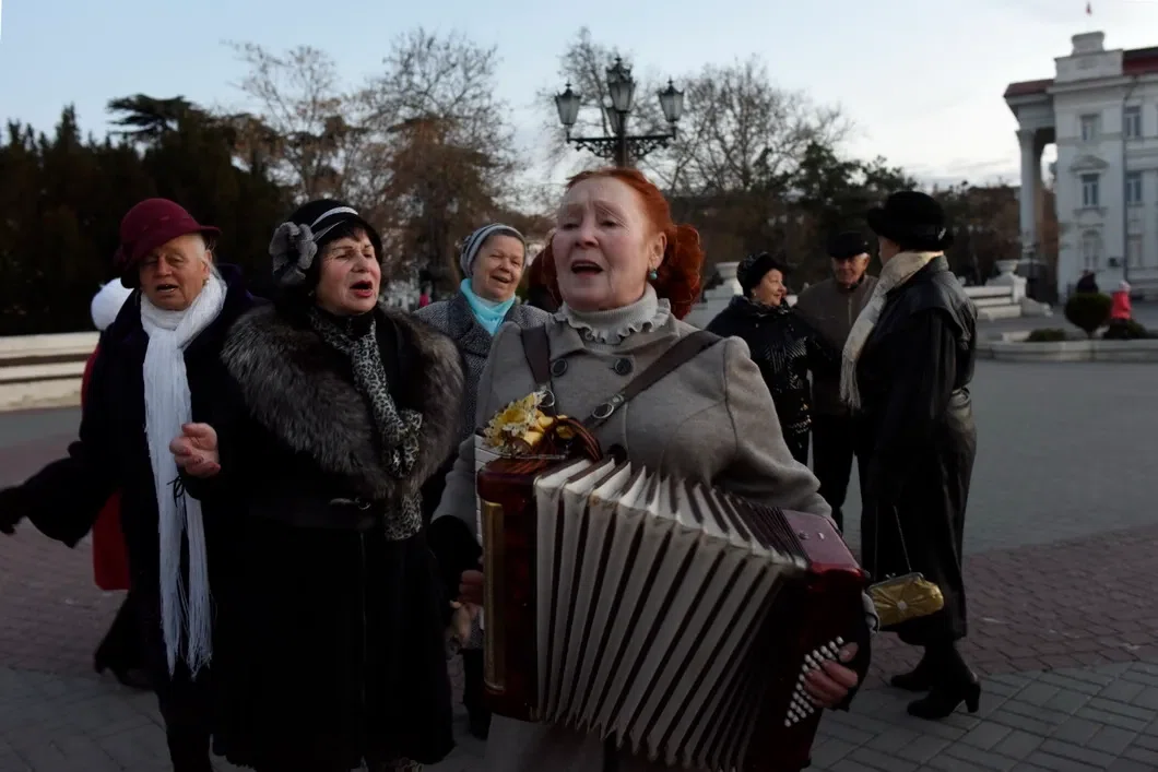 Горожанки поют на улице старые советские песни. Севастополь, ноябрь 2014 года.