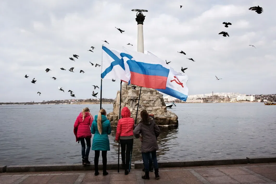 Дети с флагами у Памятника затопленным кораблям. Севастополь, ноябрь 2014 года.
