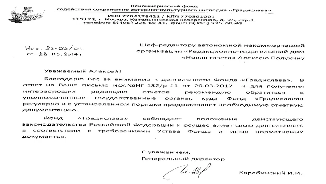 Фонд «Градислава» не очень открыт для общения с прессой. Телефон, указанный при регистрации, принадлежит лично генеральному директору Ивану Карабинскому. При разговоре с корреспондентом «Новой» он отказался дать электронный адрес или факс, заметив: «Я же не могу вас идентифицировать как журналиста», — и предложил принести запрос в офис.