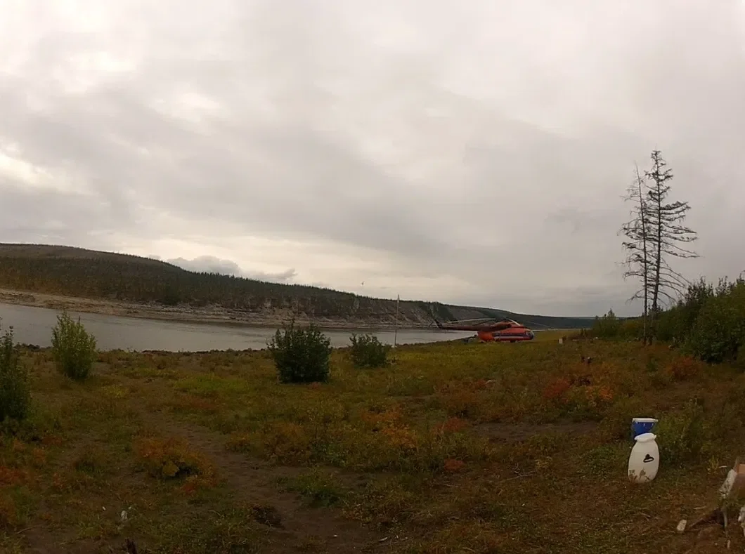 В видеозапись приготовления ухи снова попал вертолет. Что интересно, это вертолет с характерной красно-синей раскраской авиакомпании «Таймыр».
