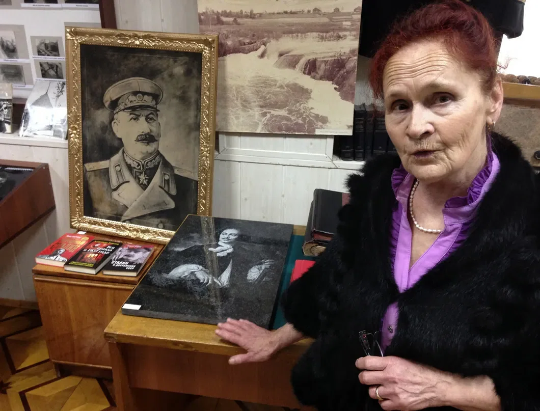 Кузнецова, в пурпурной блузке и полушубке черного меха, ведет меня по периметру комнаты — вдоль фотографий инженеров, проектных документов, вырезок из лагерной газеты «Перековка».