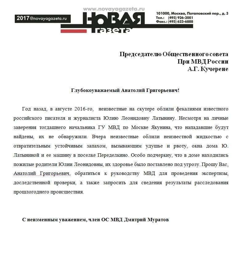 Нападение на Юлию Латынину редакция «Новой газеты» расценивает как уголовное преступление.
