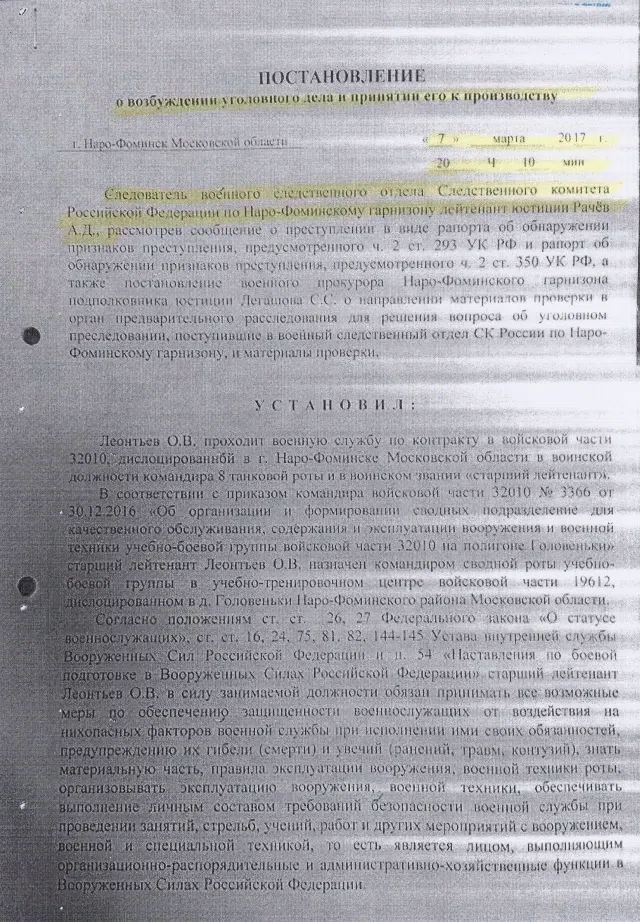 Однако в редакции «Новой» имеется копия постановления о возбуждении уголовного дела № 1.17.0200.3307.000017 от 7 марта 2017 года в отношении Леонтьева О.В. Военный следователь указывает, что «за рядовым Горбуновым по состоянию на 6 февраля 2017 года танк Т-80У, бортовой номер 436, не закреплялся, обучение работе на данном образце технике рядовым Горбуновым завершено не было, достаточных практических навыков управления танком он не имел, экзамен (зачет) на допуск к самостоятельной работе на названном образце ВВТ им не сдавался, удостоверение механика-водителя установленным порядком ему не выдавалось. <…> Рядовой Горбунов И.А. не мог быть допущен к самостоятельному управлению танком Т-80У. <…> Старший лейтенант Леонтьев, будучи осведомленным об отсутствии у рядового Горбунова достаточных практических навыков самостоятельного управления танком и выданного <…> удостоверения механика-водителя, отдал тому устный приказ осуществить управление танком <…>, в состав экипажа которого Горбунов включен не был».