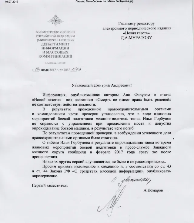 На эту публикацию немедленно отреагировало Министерство обороны. Департамент информации и массовых коммуникаций ведомства сообщил, что версия гибели срочника всегда была только одна («механик-водитель танка Илья Горбунов не справился с управлением при преодолении моста и допустил опрокидывание боевой машины»), а по результатам проведенной проверки «в возбуждении уголовного дела было отказано».