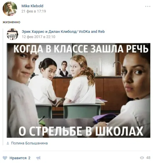 Еще раньше, в феврале этого года, Михаил делает репост похожего содержания. Насилия там еще нет. Посыл в другом: «когда в классе зашла речь о стрельбе в школах» — все смотрят на меня. На Михаила? Репост он комментирует: «жизненно».