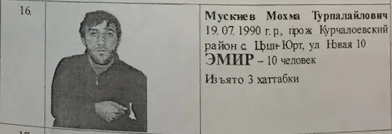 По имеющимся в распоряжении редакции документам из МВД Чечни, Мохма Мускиев проходит в полицейской базе как «амир», то есть лидер бандформирования, численность которого, по оперативным данным, составляет не менее 10 человек. По свидетельству одного из сотрудников чеченской полиции, непосредственно находившегося на базе ППСП им. Кадырова в ту ночь, когда имела место внесудебная расправа, первыми были казнены 13 человек, считавшиеся «амирами». В том числе Мускиев Мохма.