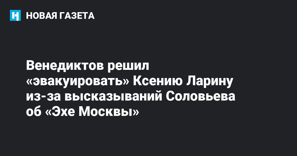 Главный редактор радиостанции «Эхо Москвы» Алексей Венедиктов рассказал об «эвакуации» из России журналистки Ксении Лариной после высказывания журналиста ВГТРК Владимира Соловьева. Об этом Венедиктов заявил в эфире Дождя.