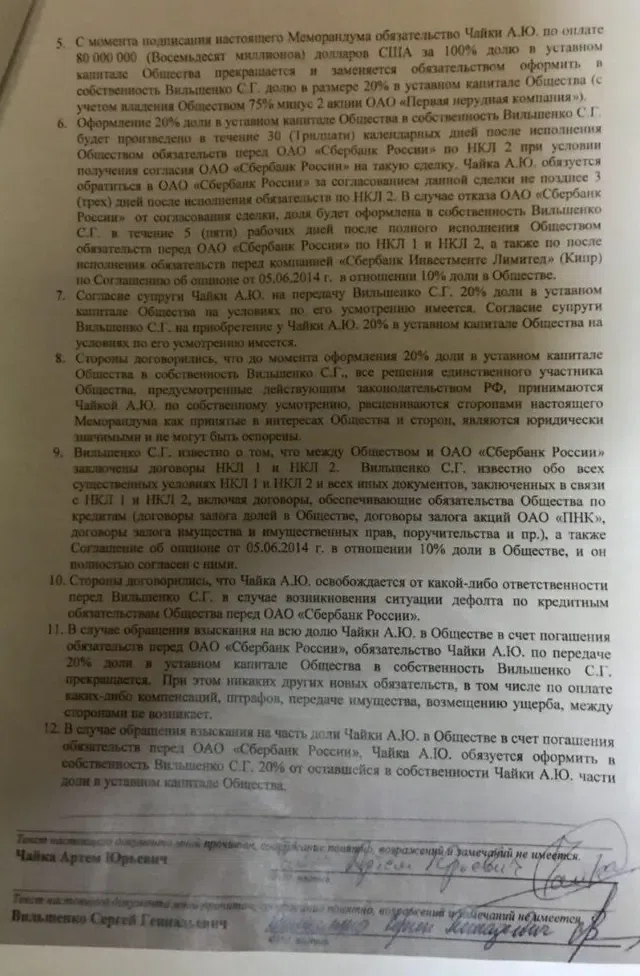 В этом же первом пункте «Меморандума» зафиксировано, что еще в феврале 2014 года стороны оценили стоимость доли Сергея Вильшенко в НК «Бердяуш» в 80 миллионов долларов (около 4,6 миллиарда рублей по текущему курсу ЦБ. — И. М.). А в п. 5 «Меморандума» записали, что обязательство Чайки заплатить Вильшенко 80 млн долларов «прекращается и заменяется обязательством оформить в собственность Вильшенко» 20% акций в ОАО «Первая нерудная компания».