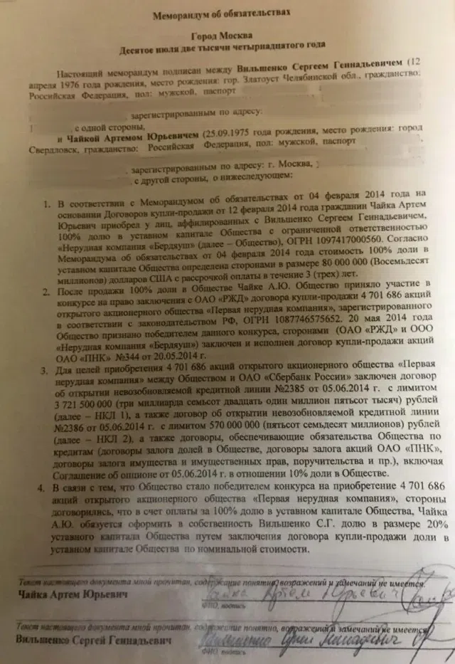 Что это за документы, обнародования которых за пределами России кто-то может опасаться? Прежде всего — это «Меморандум об обязательствах», подписанный 10 июля 2014 года бизнесменом Артемом Чайкой и Сергеем Вильшенко.