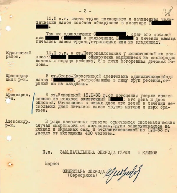 «За последние месяцы в некоторых областях Советского Союза установлен ряд случаев людоедства, продажи человеческого мяса на рынках и убийств с этой целью.