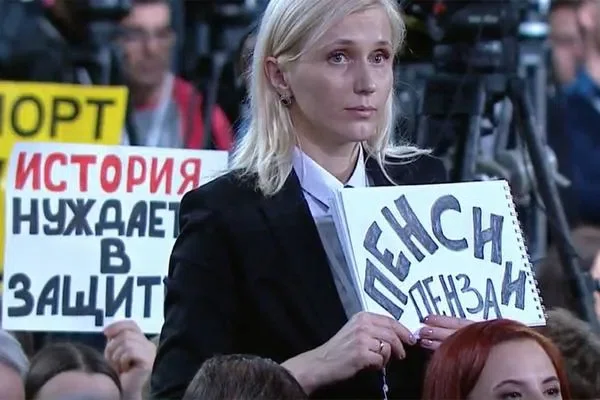 Путин предлагает передать слово девушке с плакатом «Путин бай-бай». Она объсняет, что это «бабай», дедушка по-татарски и задает вопрос о татарском языке.
